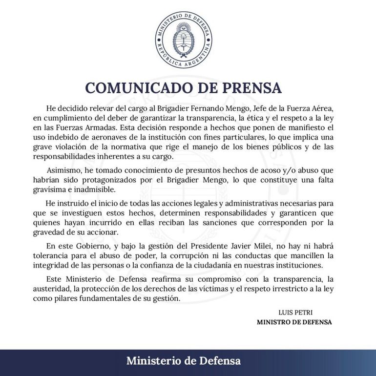 El ministro de Defensa, Luis Petri, resolvió este jueves desplazar al brigadier Fernando Mengo como jefe de la Fuerza Aérea Argentina. Según el comunicado, la medida se debe a "hechos que ponen de manifiesto el uso indebido de aeronaves" y además de tomar conocimiento de "presuntos hechos de acoso y/o abuso".