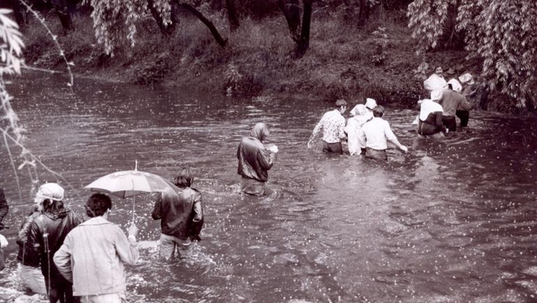 Federico Lanusse, veinteañero en ese entonces, completa su relato mostrándome una foto que encontró en la contratapa de un libro. “Cuando estoy por cruzar el rio, tropiezo con una mujer, con pantalones negros y un paraguas. Le digo “señora no cruce, se va a mojar toda”.