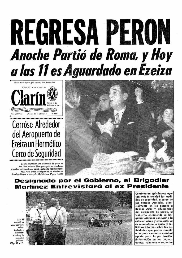 El martes 7 de noviembre, Perón fijó fecha de regreso para el 17 del mismo mes. 160 personas acompañarían al general en el avion Giussepe Verdi de Alitalia. Mitad por protocolo y mitad por seguridad (si derribaban el avión mataban a 160). No era un supuesto ilógico. Carlos Mugica, antes de partir, confesó ( a Federico Lanusse que lo llevo hasta Ezeiza) su temor de ser derribados . Por el otro lado, el entonces contraalmirante Massera señalaba off the record a los periodistas de Clarín y La Opinión “no llega, lo volteamos”. Lanusse por el contrario hacia ingentes esfuerzos por evitar un atentado, que lo hubiera hecho pasar a la historia, como el peor de los criminales.