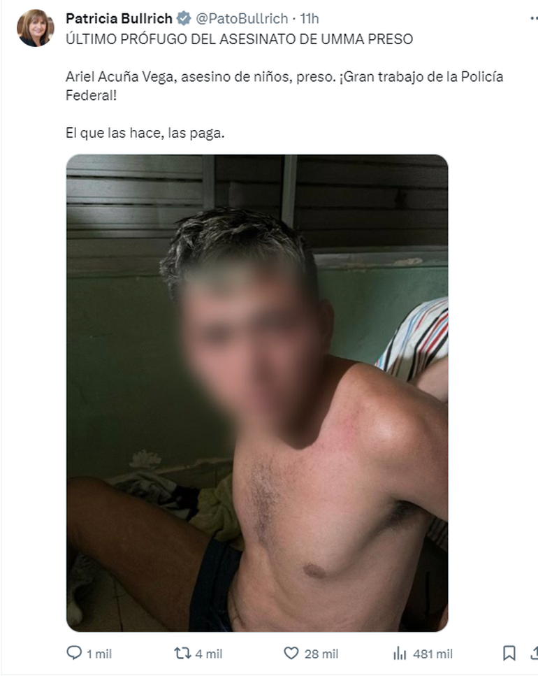 "Último prófugo del asesinato de Umma preso. Ariel Acuña Vega, asesino de niños, preso. ¡Gran trabajo de la Policía Federal!", confirmó esta noche a través de su cuenta en la red social X la ministra Bullrich.