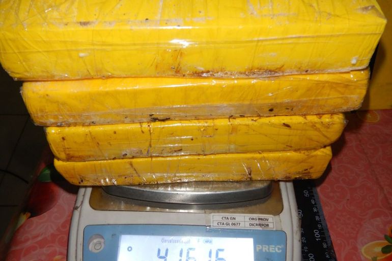 La tapa del tacho de pintura se desprendió y de su interior cayeron paquetes similares a los utilizados para el tráfico de estupefacientes. Asimismo, en la mochila también se encontraron “ladrillos” y se contabilizaron un total de quince bultos que contenían cocaína.