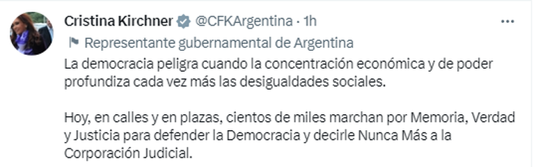 Por su parte, Cristina Kirchner, expresó: "La democracia peligra cuando la concentración económica y de poder profundiza cada vez más las desigualdades sociales" y agregó: "Hoy, en calles y en plazas, cientos de miles marchan por Memoria, Verdad y Justicia para defender la Democracia y decirle Nunca Más a la Corporación Judicial".