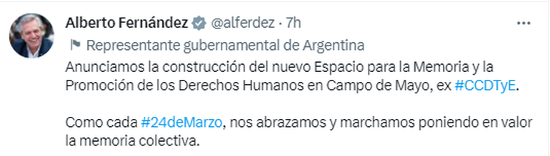 "Anunciamos la construcción del nuevo Espacio para la Memoria y la Promoción de los Derechos Humanos en Campo de Mayo, ex #CCDTyE. Como cada #24deMarzo, nos abrazamos y marchamos poniendo en valor la memoria colectiva", escribió el presidente el viernes por la mañana en sus redes.