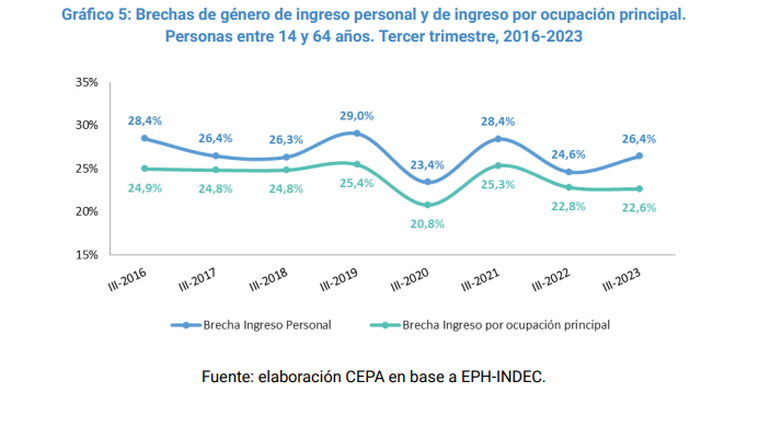 El estudio destaca que “mientras la brecha por ocupación principal se redujo levemente con respecto a 2022, la brecha de ingreso personal aumentó 1,8 puntos con respecto al mismo trimestre de 2022”.