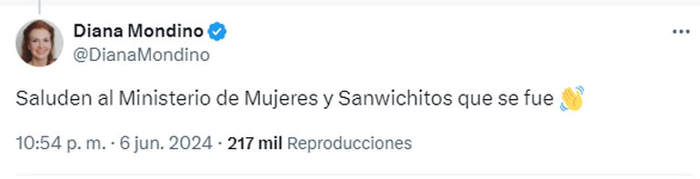 No obstante, para la canciller Mondino no solo fue una decisión digna de aplausos, sino también de burla. A la publicación de Adorni, la funcionaria respondió, a través de la red social X (ex Twitter), con aplausos y con la frase: “Saluden al Ministerio de Mujeres y Sanwichitos que se fue”.