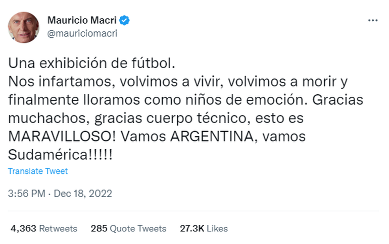 "Una exhibición de fútbol. Nos infartamos, volvimos a vivir, volvimos a morir y finalmente lloramos como niños de emoción. Gracias muchachos, gracias cuerpo técnico, esto es MARAVILLOSO! Vamos ARGENTINA, vamos Sudamérica!!!!!", escribió Macri en sus redes sociales y agregó: "Somos afortunados de vivir en la época de Lionel y poder verlo jugar. Orgullo es poco. Lo merecías más que nadie, gracias por traer la copa a los argentinos!!!!!".