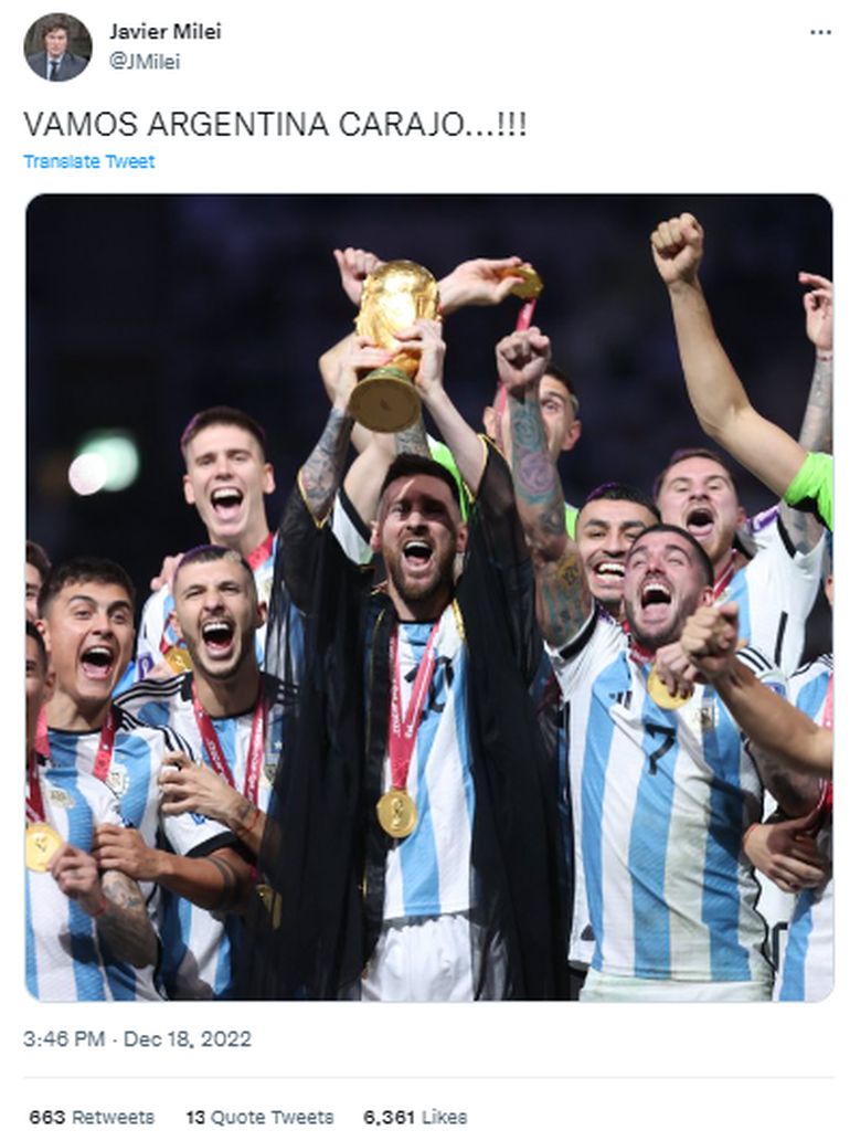 Por último, el diputado nacional libertario Javier Milei también festejó en sus redes sociales con el clásico "Vamos Argentina carajo...!!!" y lo acompañó con varias imágenes de los jugadores.