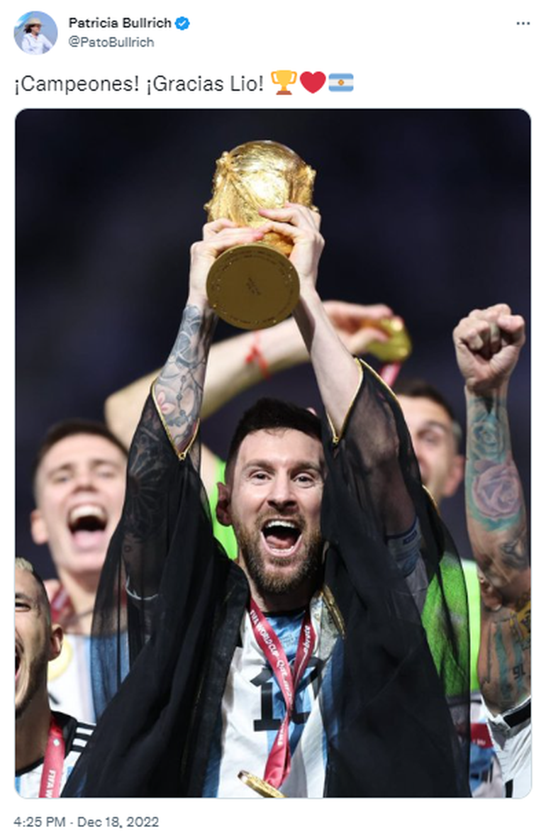 La presidenta del PRO, Patricia Bullrich, por su parte, resaltó el trabajo de la Selección argentina y de su capitán, Lionel Messi: "¡Campeones!, ¡Gracias Lio!".