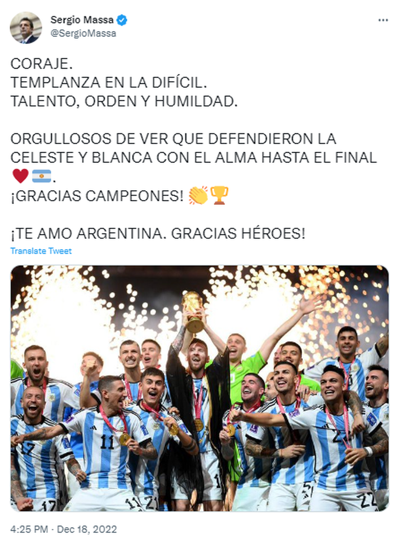 Por su parte, el ministro de Economía, Sergio Massa, hizo un posteo en el que destacó el "coraje y templanza" de los jugadores de la Selección argentina encabezados por Lionel Messi.