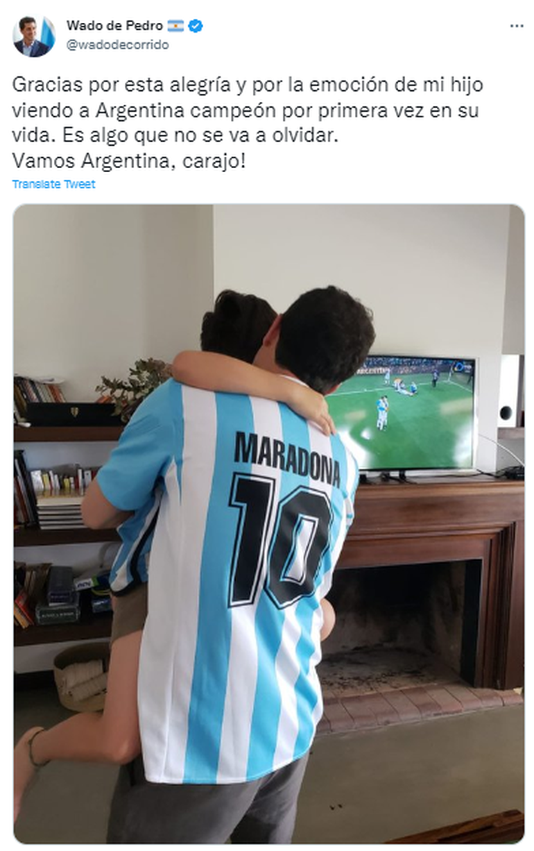 El ministro del Interior, Eduardo 'Wado' De Pedro, sostuvo: "Gracias por esta alegría y por la emoción de mi hijo viendo a Argentina campeón por primera vez en su vida. Es algo que no se va a olvidar. Vamos Argentina, carajo!".