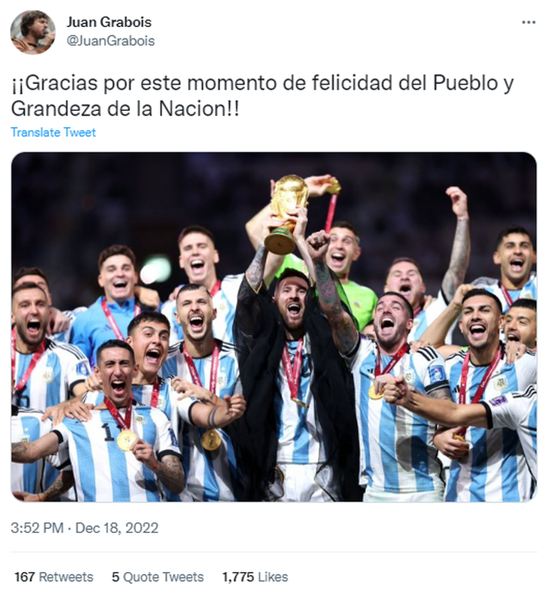 El líder del Frente Patria Grande y el Movimiento de Trabajadores Excluídos (MTE), Juan Grabois, también le dedicó palabras de agradecimiento al equipo dirigido por Lionel Scaloni: "por este momento de felicidad del Pueblo y Grandeza de la Nación".