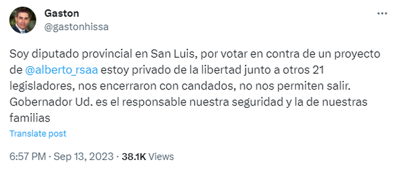 De esa forma, los diputados no podían salir de la Legislatura y quedaron atrapados. Al respecto, Gastón Hissa, diputado de la oposición expresó en Twitter: "Soy diputado provincial en San Luis, por votar en contra de un proyecto de Alberto Rodríguez Saá estoy privado de la libertad junto a otros 21 legisladores, nos encerraron con candados, no nos permiten salir. Gobernador Ud. es el responsable nuestra seguridad y la de nuestras familias".