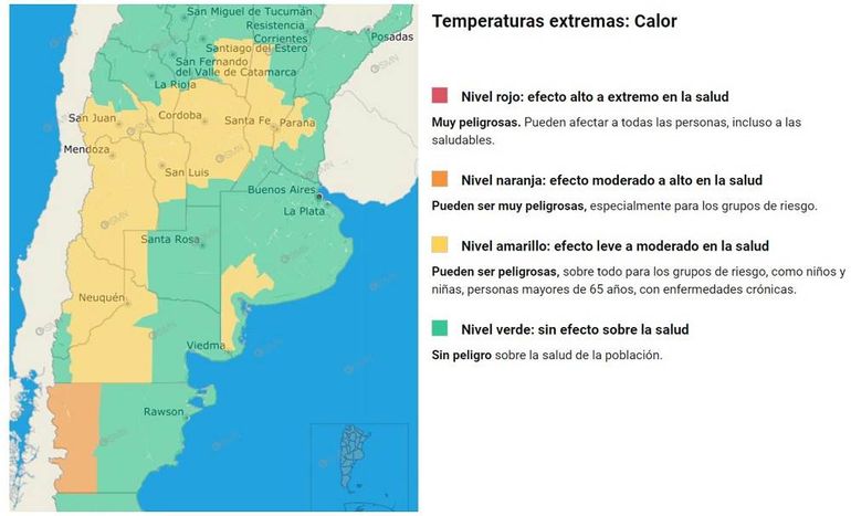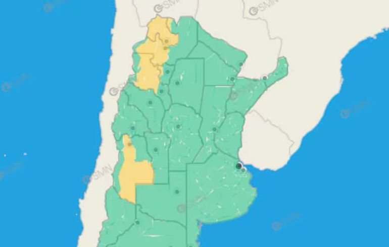 De esta manera, se mantiene la alerta amarilla que regía para algunas partes de las provincias de Buenos Aires, Entre Ríos, Santa Fe, Santiago del Estero, Córdoba, San Luis, San Juan, La Rioja, Mendoza, La Pampa, Neuquén, Río Negro y Chubut.