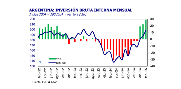 “El Índice de Inversión Bruta Interna Mensual (IBIM-OJF) registró para febrero una expansión de la inversión de 29,3% interanual medido en términos de volumen físico (sin contar el efecto de la inflación)”,afirma Ferreres.