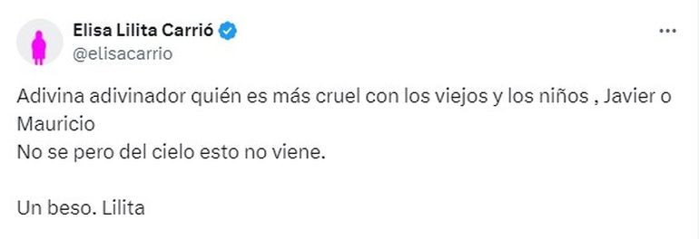 "Adivina adivinador quién es más cruel con los viejos y los niños, Javier o Mauricio. No se pero del cielo esto no viene. Un beso. Lilita", compartió en X (ex Twitter), haciendo clara referencia a "las fuerzas del cielo", el slogan que el Gobierno de Javier Milei adoptó hace ya tiempo.