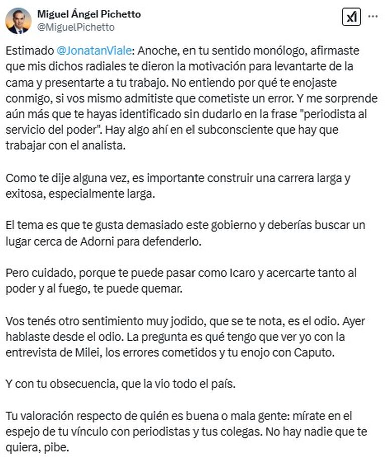 Todo comenzó en el descargo de Viale el día posterior a la entrevista. En pleno revoleo de acusaciones y responsabilidades, el periodista apuntó directamente contra Pichetto por un dicho en el que había mencionado a los "periodistas al servicio del poder", aunque sin mencionar al hijo de Mauro Viale.