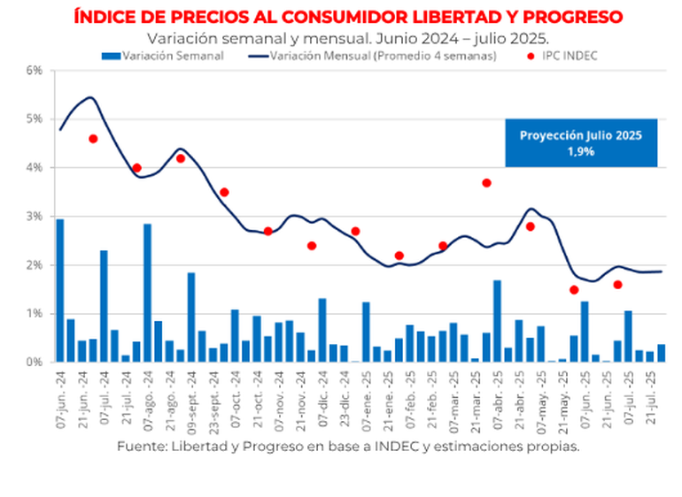 "En julio, el IPC LyP registró un incremento del 1,9% mensual, sosteniéndose por debajo del 2% por tercer mes consecutivo. Con este resultado, la inflación acumulada en el primer semestre del año se ubica en 17,3%, mientras que la variación interanual alcanzó el 36,5%, la más baja desde enero de 2021" ,informó la Fundación Libertad y Progreso.