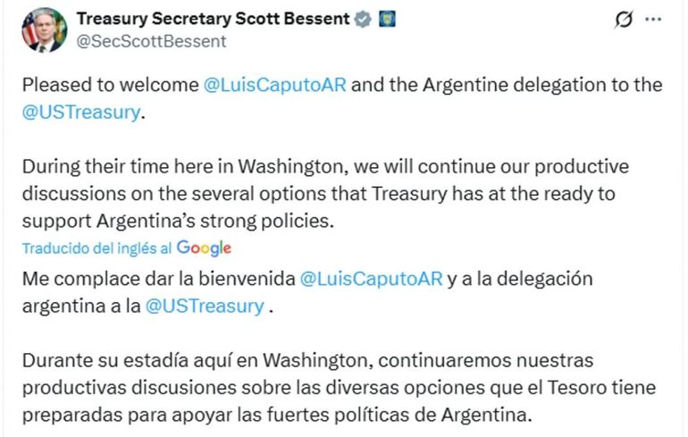 El anuncio del secretario del Tesoro, Scott Bessent, a través de a red social X implica que pase lo que pase este mes en el campo político, el programa del ministro de Economía, Luis Caputo, se mantendrá, lo que quiere decir que seguirán las bandas de flotación.