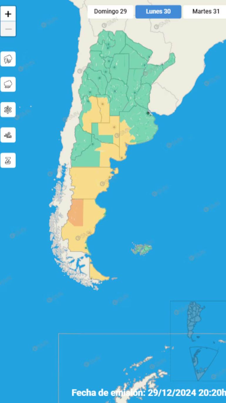En el caso de Santa Cruz, las condiciones serán más severas, dado que los vientos del sector sur estarán acompañados de fuertes lluvias que se extenderán desde el 30 por la tarde hasta el mediodía del último día del año. La región central de la provincia estará bajo alerta naranja hasta el día siguiente debido a fenómenos meteorológicos más rigurosos. Para el martes, las condiciones adversas se reducirán y se limitarán al este y la costa provincial.