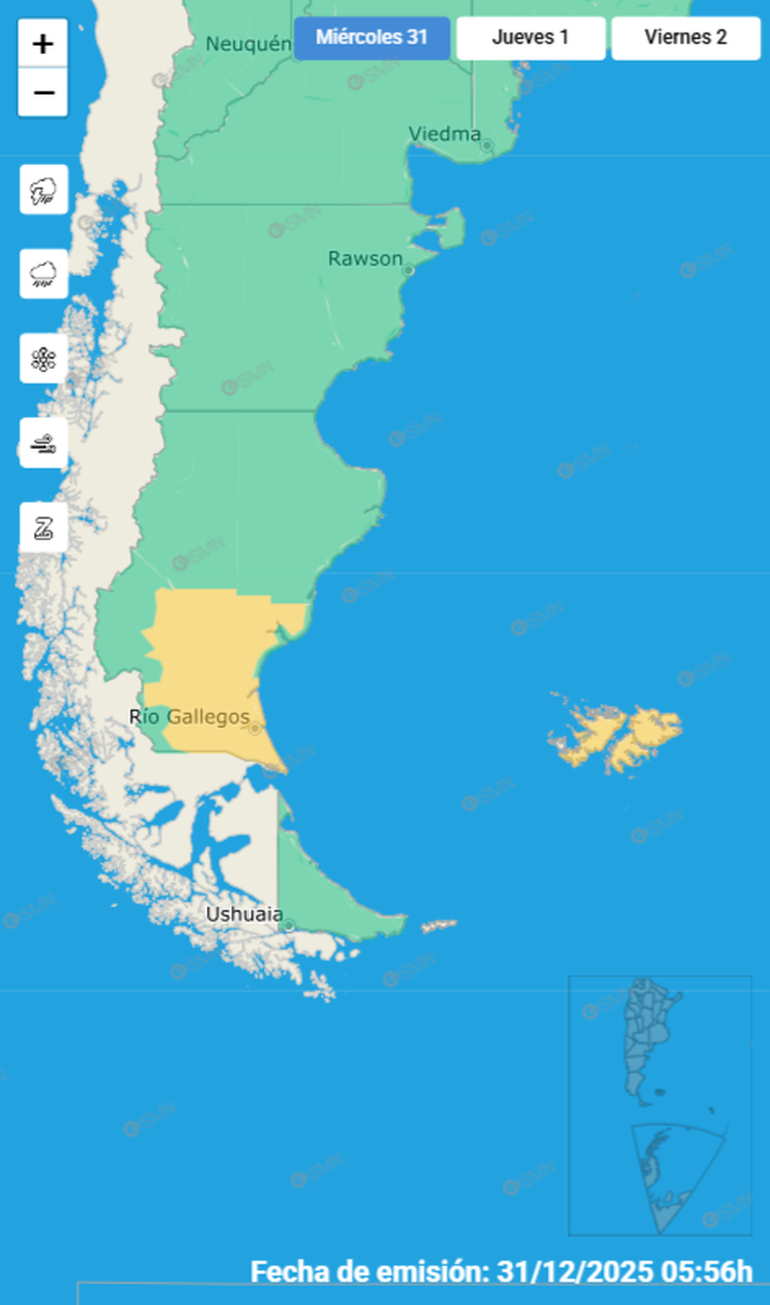 El organismo nacional precisó que rige otra alerta amarilla por vientos para este 31 de diciembre, que tendrá impacto en el sur de Santa Cruz y la provincia de Tierra del Fuego.
