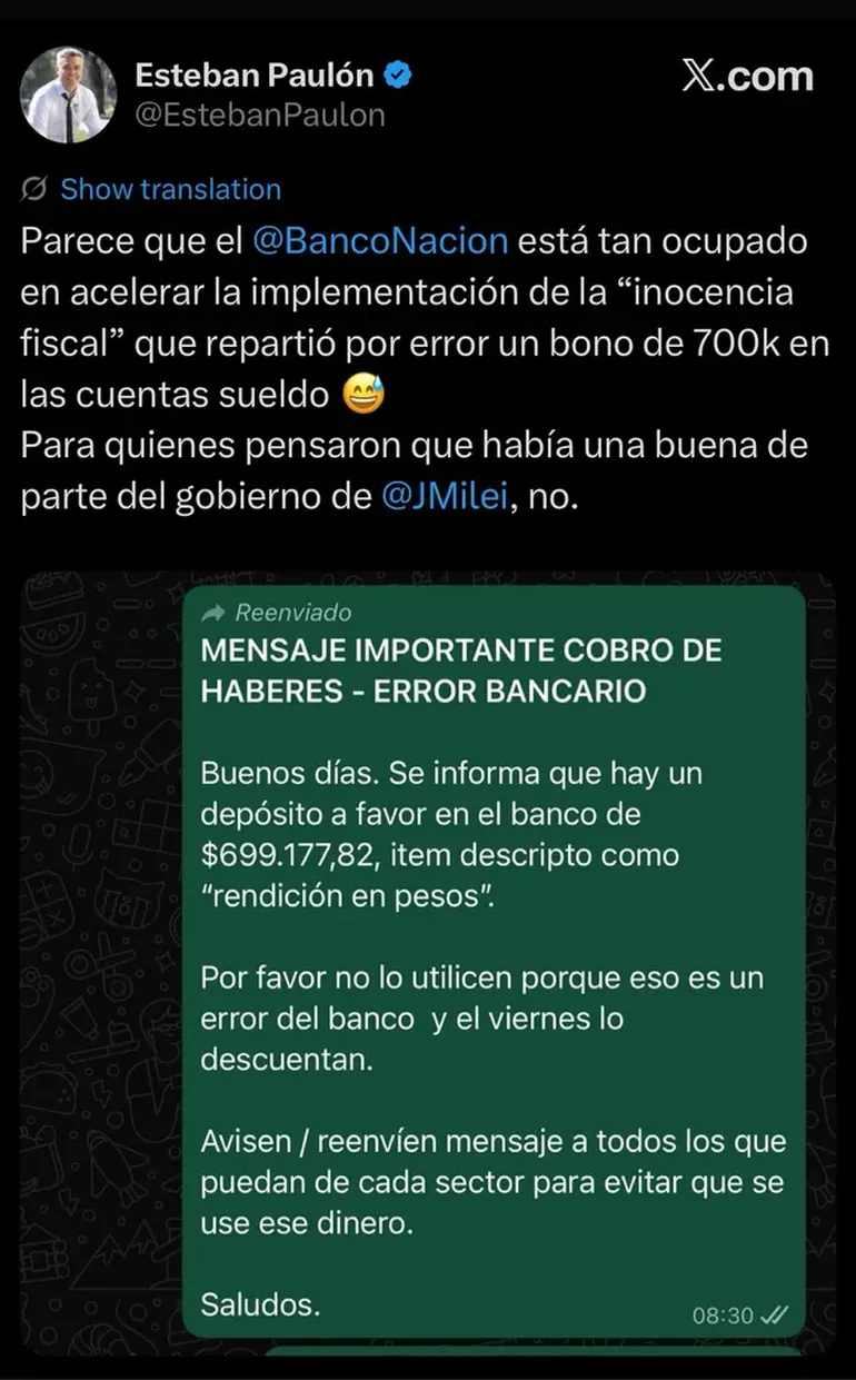 “Parece que el Banco Nación está tan ocupado en acelerar la implementación de la ‘inocencia fiscal’ que repartió por error un bono de 700k en las cuentas sueldo. Para quienes pensaron que había una buena de parte del gobierno de Milei, no”, ironizó el diputado santafesino a través de las redes sociales.