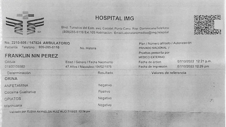 “Una prueba y/o análisis de cocaína, a cargo del señor Franklin Nin Pérez, realizado por el centro médico Hospital IMG, arrojando un resultado positivo”, detalla el documento con 16 pruebas en contra del imputado y que reveló el medio local Diario Libre.
