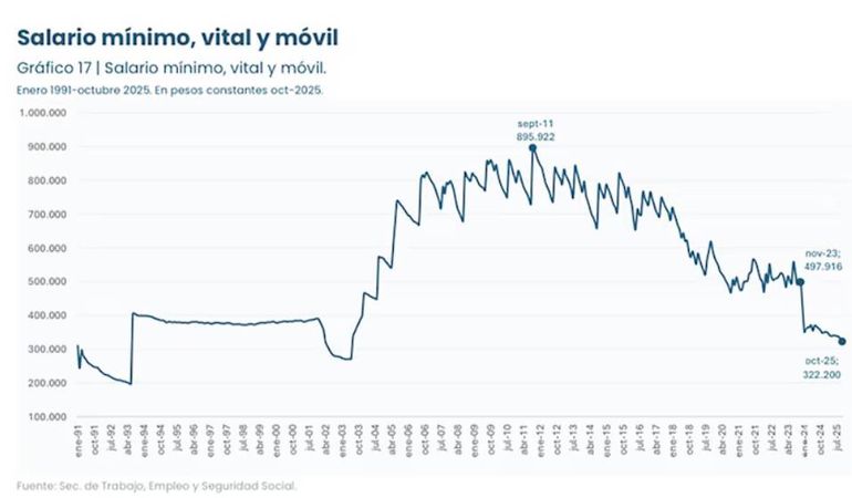 De acuerdo con estimaciones del Instituto Interdisciplinario de Economía Política (UBA-CONICET), el salario mínimo registró en octubre una caída real del 2,3%, acumulando una contracción del 35% interanual y del 64% respecto del valor máximo alcanzado en septiembre de 2011. En términos históricos, el ingreso real se ubica por debajo del nivel registrado en 2001, en la antesala de la crisis de la convertibilidad.