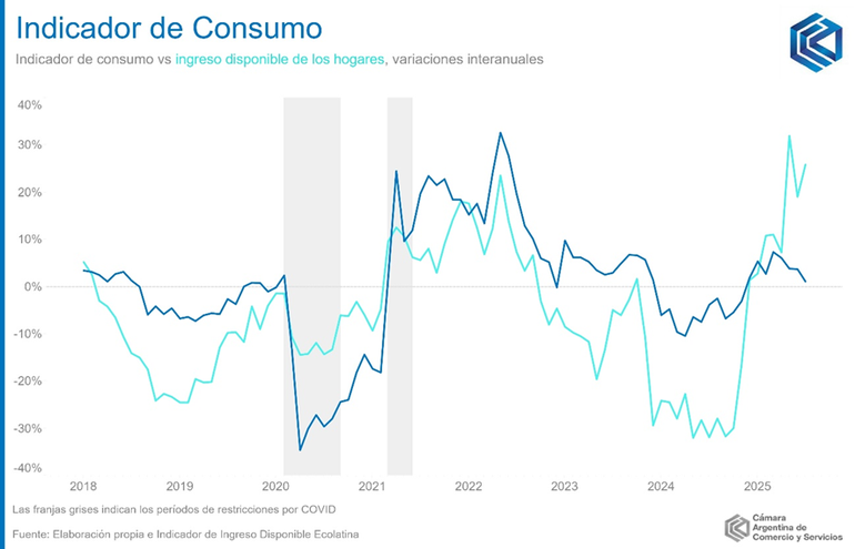 “Sin embargo, las últimas semanas estuvieron signadas por una volatilidad significativa tanto en el mercado cambiario, como en las tasas de interés de la economía. La mayor incertidumbre, en consecuencia, tiende a moderar el dinamismo del consumo, dado que los hogares postergan decisiones de gasto discrecional y elevan su propensión al ahorro precautorio”, advierte la CAC.