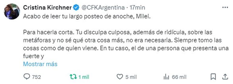 "Para hacerla corta. Tu disculpa culposa, además de ridícula, sobre las metáforas y no sé qué otra cosa más, no era necesaria. Siempre tomo las cosas como de quien viene. En tu caso, el de una persona que presenta una fuerte y sintomática disociación entre lo que hace y dice; y los efectos que sus palabras y sus medidas de gobierno provocan en la vida cotidiana de millones de argentinos", expresó CFK.