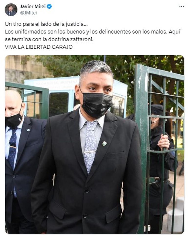 "Un tiro para el lado de la justicia... Los uniformados son los buenos y los delincuentes son los malos. Aquí se termina con la doctrina zaffaroni. VIVA LA LIBERTAD CARAJO", compartió el Presidente en su cuenta de X (ex Twitter).