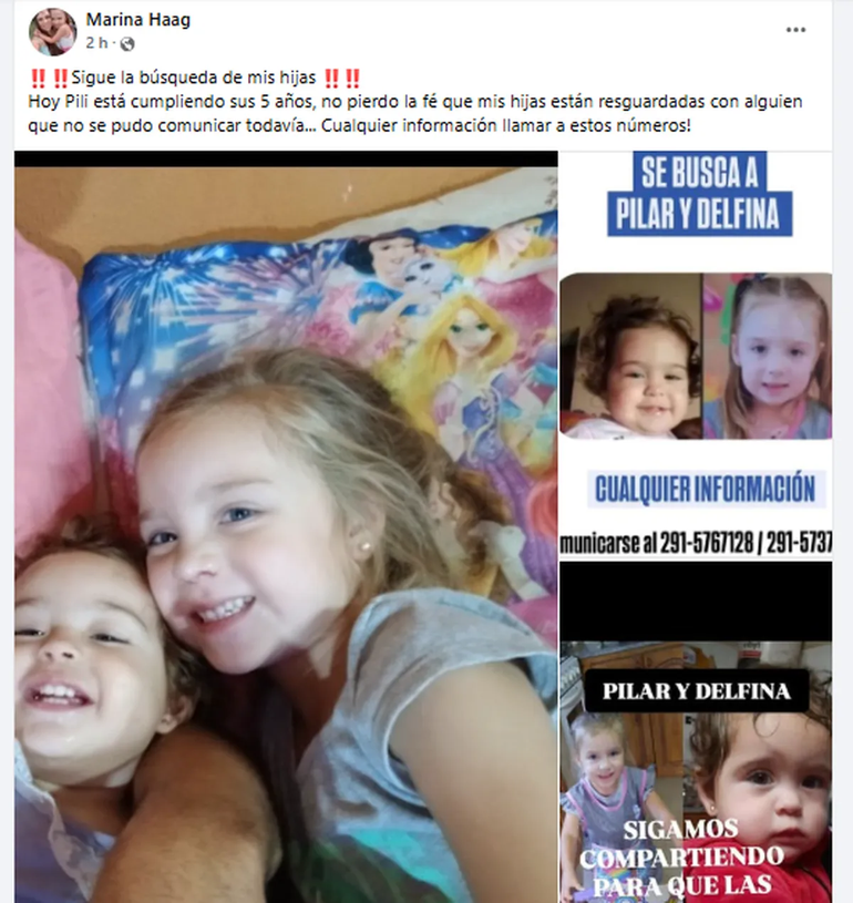 Este miércoles Marina Haag, madre de las menores, publicó en Facebook un conmovedor mensaje donde contó que hoy Pilar está de cumpleaños: "Hoy Pili está cumpliendo 5 años, no pierdo la fe de que mis hijas están resguardadas con alguien que no se pudo comunicar todavía".