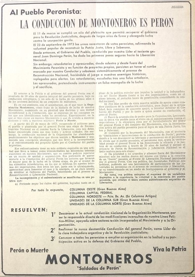 El 14 de marzo de 1974, se da a conocer públicamente el grupo “Montoneros 'Soldados de Peron'” a través de una solicitada de página entera en varios diarios.