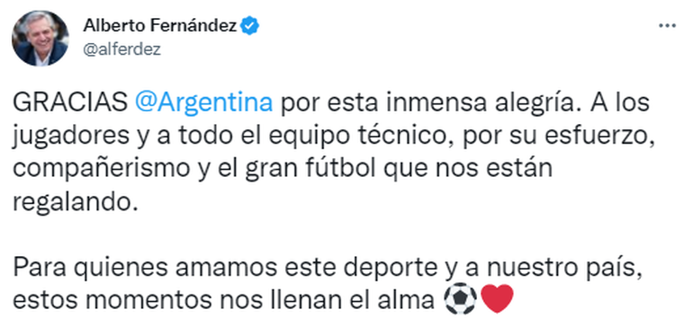 En el posteo, el jefe de Estado también agregó: "Gracias Argentina por esta inmensa alegría. A los jugadores y a todo el equipo técnico, por su esfuerzo, compañerismo y el gran fútbol que nos están regalando".