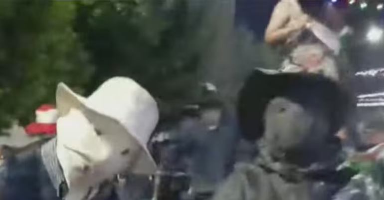 Sobre el techo del vehículo que llevaba las polémicas inscripciones, había dos hombres con sus rostros tapados, uno de ellos enfundado en un vestido y con sombrero, que a medida que el auto avanzaba, saludaba al público y se levantaba la prenda para mostrar su ropa interior.