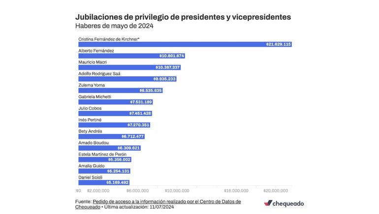 El Estado paga actualmente jubilaciones especiales a cinco expresidentes, cuatro viudas (incluida Fernández de Kirchner, hasta la revocación de sus beneficios), la hija de un expresidente (Zulemita Menem) y cuatro ex vicepresidentes. Según información de ANSES, estas asignaciones sumaron 112,3 millones de pesos brutos en mayo de 2024. Los beneficiarios de estas jubilaciones incluyen a expresidentes como Alberto Fernández, Mauricio Macri, Adolfo Rodríguez Saá y María Estela Martínez de Perón, así como a ex vicepresidentes como Gabriela Michetti y Amado Boudou.