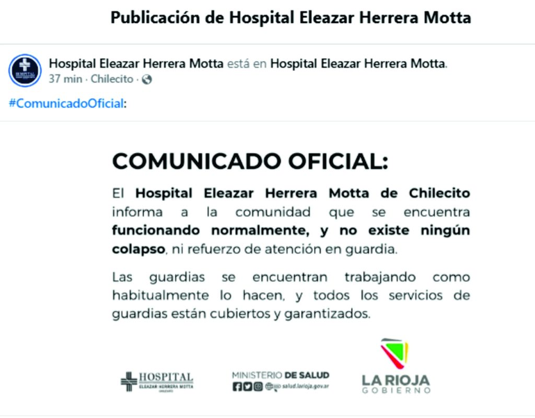 Mediante su página de Facebook, la institución realizó un comunicado. Según la publicación, se continúa brindando asistencia sanitaria con normalidad, y si bien reconoce los desafíos que enfrenta el sistema de salud, niega que se haya alcanzado un estado de crisis que impida la correcta atención de los pacientes.