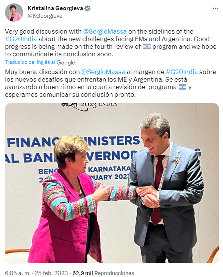 Al finalizar la reunión con Massa, Georgieva adelantó en su cuenta de Twitter: "Muy buena discusión con @SergioMassa en los pasillos del #G20India sobre los nuevos desafíos que enfrentan los EM (Mercados Emergentes) y Argentina. Buen progreso en la cuarta revisión del programa y esperamos comunicar su conclusión pronto", sostuvo.