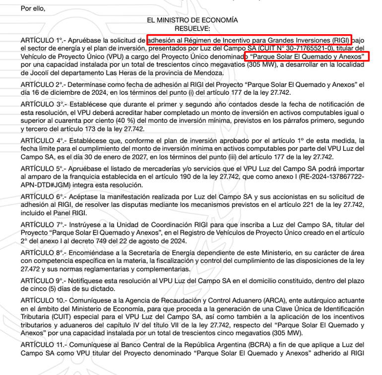 Según la resolución 1/2025 del Ministerio de Economía publicada en el Boletín Oficial, este proyecto consiste en la creación de un parque solar que estará ubicado en Jocolí, departamento Las Heras. La ambiciosa inversión será llevada adelante por la empresa Luz del Campo S.A., con una capacidad total de 305 megavatios (MW), a desarrollarse en dos etapas.
