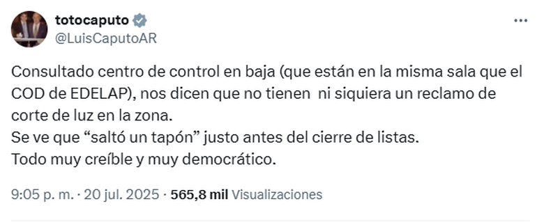 En relación a este caótico cierre de listas, el ministro de Economía, Luis Caputo, lanzó un comentario irónico que podría estar dirigido al Partido Justicialista a través de su cuenta de X: "Se ve que 'saltó un tapón' justo antes del cierre de listas. Todo muy creíble y muy democrático".