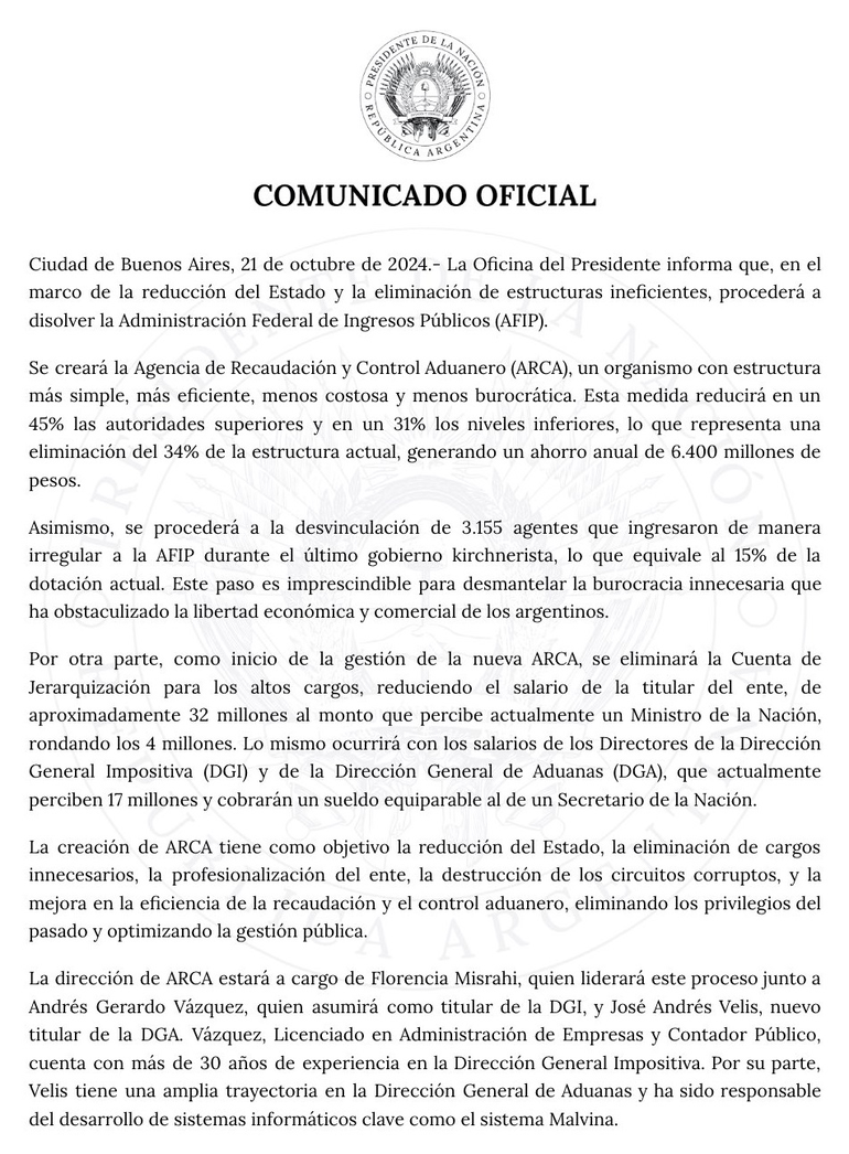 Además de la conferencia de Manuel Adorni, el Gobierno publicó un comunicado oficial sobre la disolución de AFIP. Allí, justificó la decisión "en el marco de la reducción del Estado y la eliminación de estructuras ineficientes".