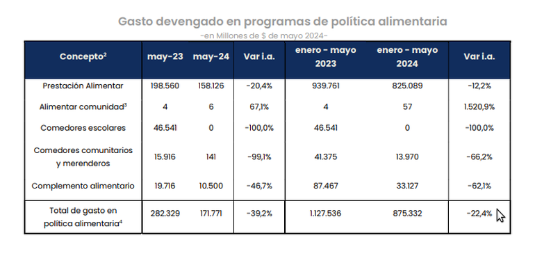 Analytica detalla que dentro de las políticas alimentarias, la más relevante es la prestación “Alimentar” que durante los primeros cinco meses representó el 94,3%. Consiste en transferencias monetarias a los beneficiarios de la AUH menores de 14 años. “En mayo tuvieron una caída del 20,4% interanual real, y en lo que va del año disminuyó un 12,2% interanual”, dice el reporte.