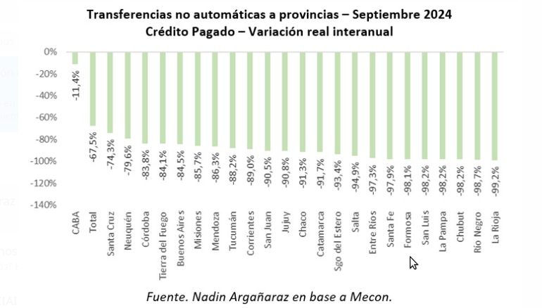 En septiembre, las provincias recibieron del gobierno nacional en concepto de transferencias no automáticas unos $280.948 millones, lo que implica una suba interanual nominal de 0,6% y una caída real de 67,5%. Si se considera el gasto devengado, se observó una suba nominal del 7,4% y una caída real del 65,3%.