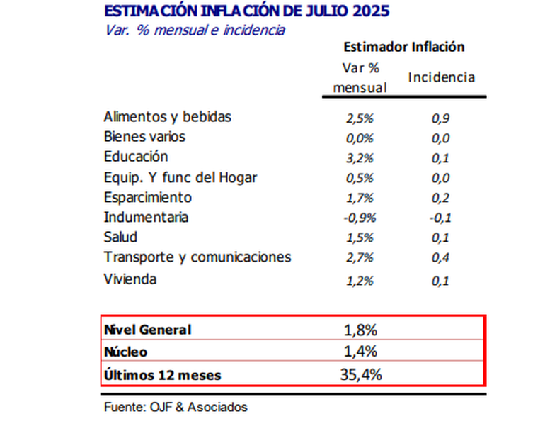 La cifra es consistente con otras estimaciones privadas. El Centro de Estudios Económicos Orlando Ferreres estimó que la inflación de julio fue de 1,8% mensual y registró un crecimiento interanual de 35,4%.