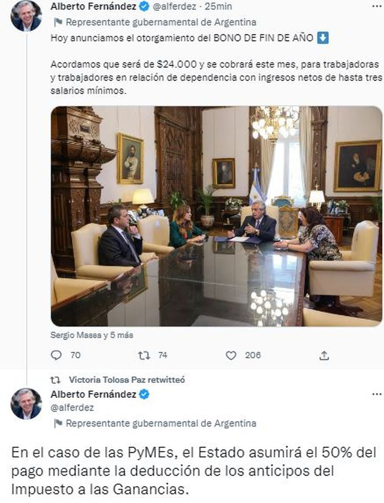 El Gobierno nacional anunció este miércoles un bono de fin de año de $24.000 para trabajadores del sector privado con remuneraciones de hasta $185.000 y de $13.500 para beneficiarios del Potenciar Trabajo que se pagará por única vez durante el transcurso de diciembre.
