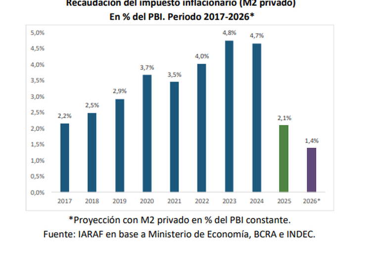 Ahora, indica el IARAF, dada una baja de la inflación promedio anual desde el 220% en 2024 al 42% en 2025 y un aumento de M2 privado equivalente a 0,3 puntos porcentuales del PBI entre ambos años, “la recaudación del impuesto inflacionario puede llegar a bajar 2,6 puntos porcentuales del PBI durante 2025, terminando el año en 2,1% del PBI”.