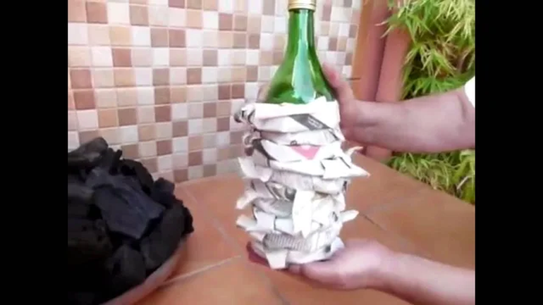 - El último paso es sacar cuidadosamente la botella sin que se muevan las anillas de papeles. Allí hay que encender el papel de diario con un fósforo y listo: en menos de 20 minutos estarán listas las brasas.