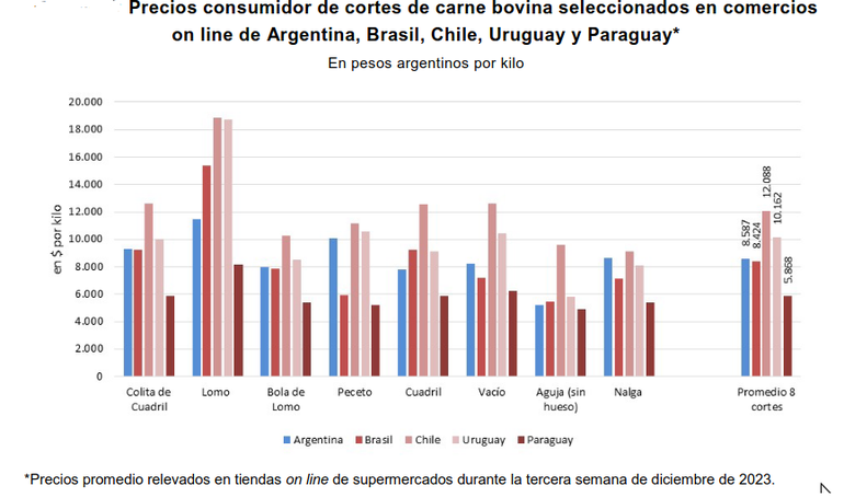 En diciembre de 2023, luego de Paraguay, aparece Brasil como el país de carne más barata de la región, lugar que le había arrebatado momentáneamente Argentina en enero, mes previo al ajuste de precios de hacienda y carne que se produciría hacia fines de ese mes y en febrero; por otro lado, Chile se mantiene como es habitual como el país de carne bovina más cara a nivel consumidor.