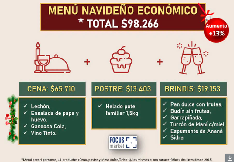 Por otro lado, Focus Market indica que “el Menú Intermedio este año suma un total de $196.599, y está formado por un Plato principal con Asado del centro, gaseosa cola (primera marca), vino y ensalada de papa y huevo. El Postre es 1 kilo de Helado artesanal, y el Brindis/Mesa dulce consta de 1 pan dulce con frutos secos, 1 budín con chips de chocolate, 1 garrapiñada de maní, 1 turrón de almendras, 1 espumante de fresa y 1 champagne.