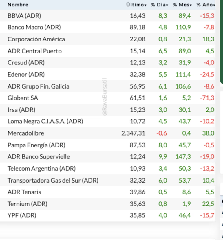 Entre las empresas argentinas que cotizan en Wall Street (ADR), predominan los avances. Las mayores subas corresponden a Banco Supervielle (+9,9%), Banco Francés (+8,3%) y Pampa Energía (+8%), en un contexto de fuerte recuperación de precios en todo el segmento financiero y energético.