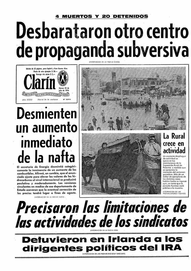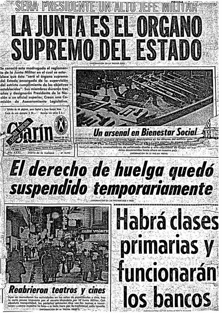 Si uno revisa la tapa de los diarios de los primeros meses de la dictadura de 1976, va a encontrar junto a los titulares de “extremistas abatidos”, otros como “suspenden derecho a huelga”, “intervienen sindicatos”, “fijan pautas para reformar la legislación de trabajo”.